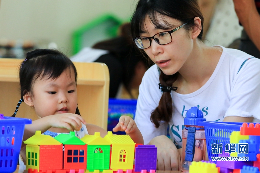 換個新環境,照樣有玩具、有陪伴。4日,一名家長陪伴孩子在幼兒園里玩耍。新華網 肖和勇 攝 -