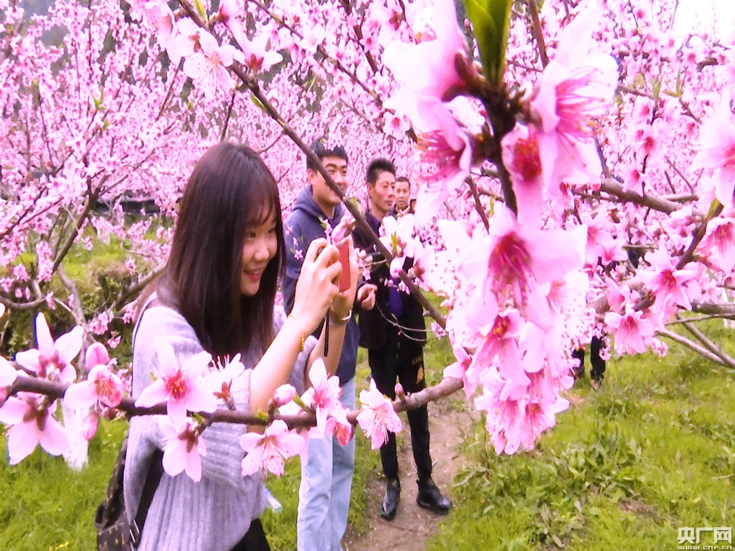 游客在桃園里賞花拍照。(陳一沿攝)