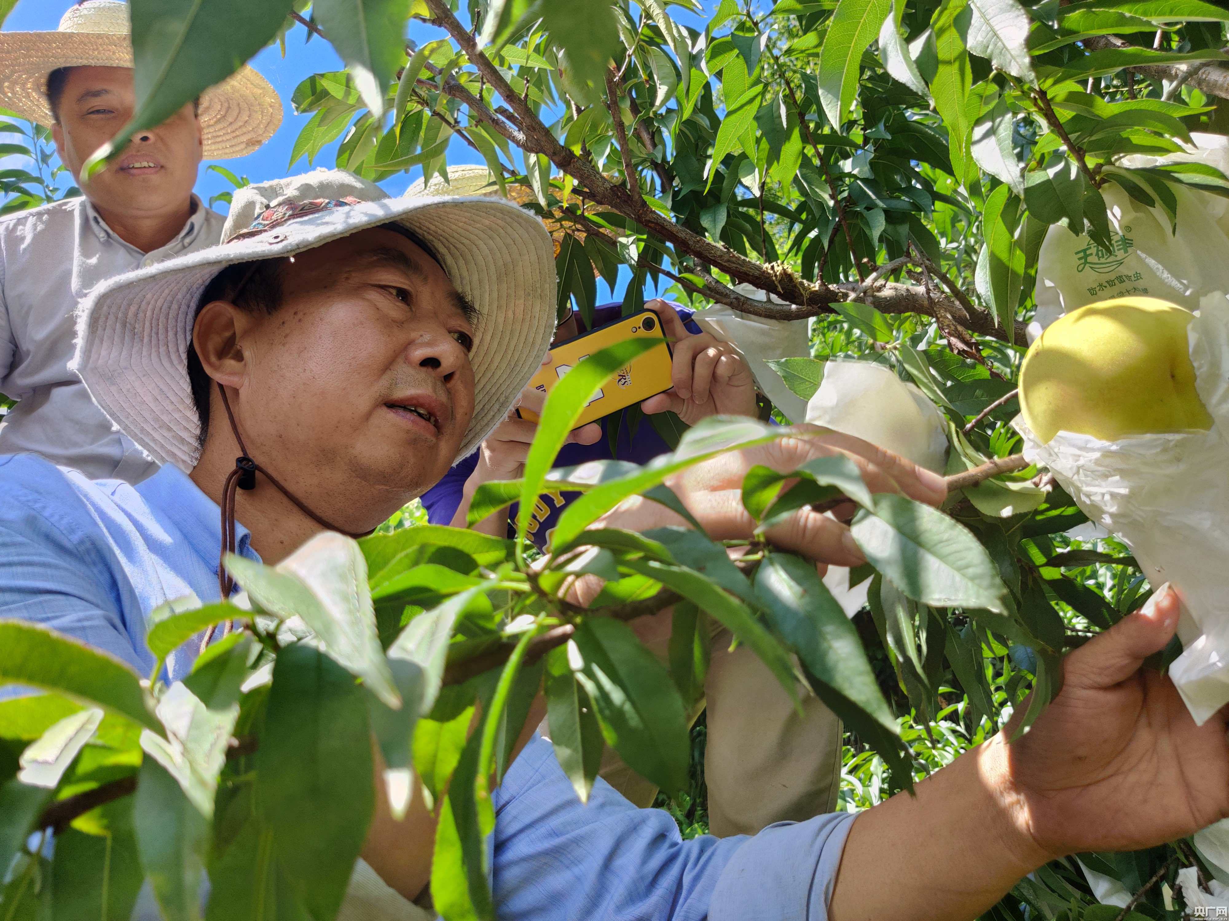 2020年7月,錦繡黃桃豐收,熊長華在果園中察看。(蔡雅玲攝)