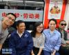 5月1日,全國勞模吳曉紅(右二)、劉志堂(左二)在“勞模地鐵專列”車廂內與乘客合影。 “五一”勞動節期間,一列“勞模地鐵專列”亮相長沙地鐵1號線。該列車在車廂內集中展示了由全國勞模、攝影家謝子龍拍攝的88位不同崗位全國勞模的肖像作品,旨在展示“勞動最光榮、勞動最崇高、勞動最偉大、勞動最美麗”的精神。新華社發(陳思維 攝) -