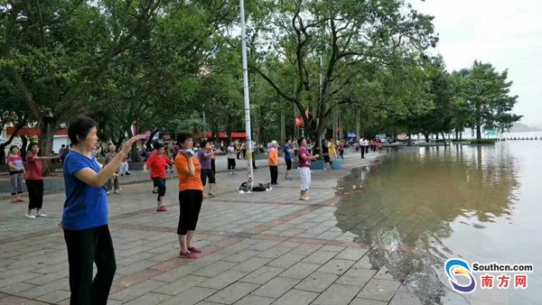 據南方網報道,7月4日上午8時,記者從肇慶封開縣舊縣城江濱公園看到,昨天傍晚起天氣由雨轉陰,上午8時許雖然可見烏云,但是舊縣城水位開始下退,江濱公園迎來了一大批晨運的市民。
