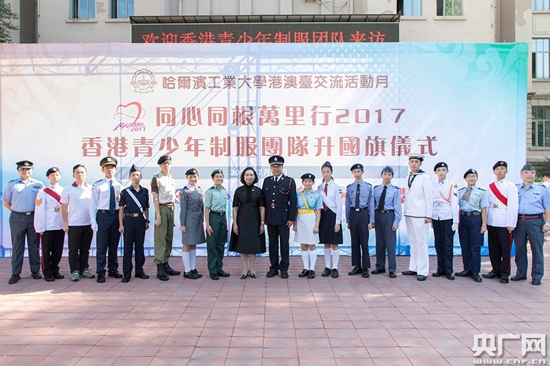 緊接于7月24日早上,一眾交流團團員前往哈爾濱工業大學舉行升旗儀式,更由香港的制服團體青少年代表擔任旗手和護旗手。黑龍江省委常委兼副省長賈玉梅女士亦有出席。賈玉梅副省長致辭時表示,適逢香港回歸20周年,香港的制服團體隊伍來到黑龍江進行龍港青少年互動交流有非常重要的意義,希望香港青少年加深對內地的了解,成為愛國愛港的薪火傳人,為香港的繁榮穩定和中華民族的偉大復興貢獻自己的青春和力量。之后梁唐青儀榮譽團長、賈玉梅副省長及李鋈麟團長檢閱各制服團體的步操隊伍,然后眾人一同前往參觀哈爾濱工業大學的航天館,了解當地的航天國防科技及成就。
