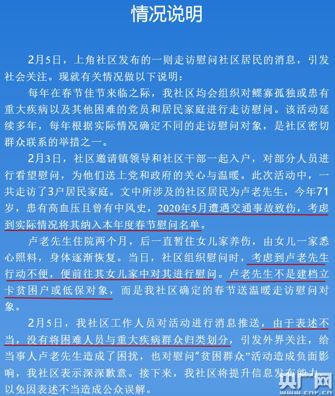 根據(jù)2月6日發(fā)布的情況說明,文中所涉及的社區(qū)居民盧老先生,今年71歲,患有高血壓且曾有中風(fēng)史,2020年5月遭遇交通事故致傷,不是建檔立卡貧困戶或低保對(duì)象,而是該社區(qū)確定的春節(jié)送溫暖走訪慰問對(duì)象。