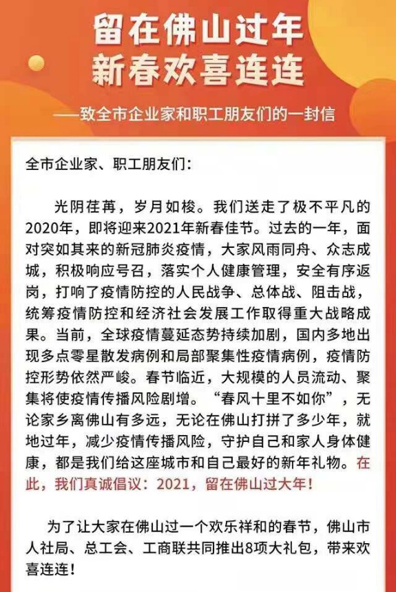12日,佛山市多部門聯合推出8項禮包,號召廣大職工盡量留在佛山度過一個歡樂祥和的春節。