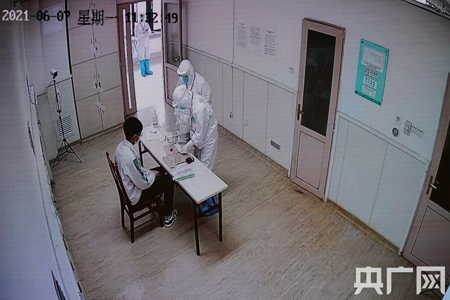 醫(yī)護人員為隔離考生處理考試用品。(央廣網(wǎng)記者官文清 攝)