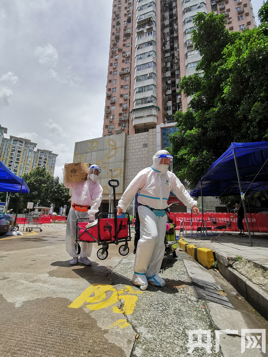 志愿者為封閉封控區(qū)居民配送物資。(央廣網(wǎng)發(fā) 廣州市宣供圖)