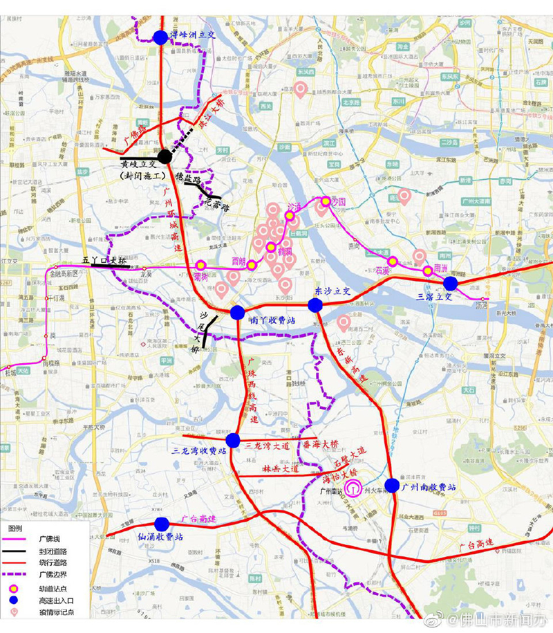 地方道路方面,結合廣州市封控區(qū)域道路管控情況,對佛山與廣州市封控區(qū)域接壤的道路:廣佛新干線(因道路施工前期已封閉)、穗鹽路、五丫口大橋、沙尾大橋等全部實施雙向封閉。