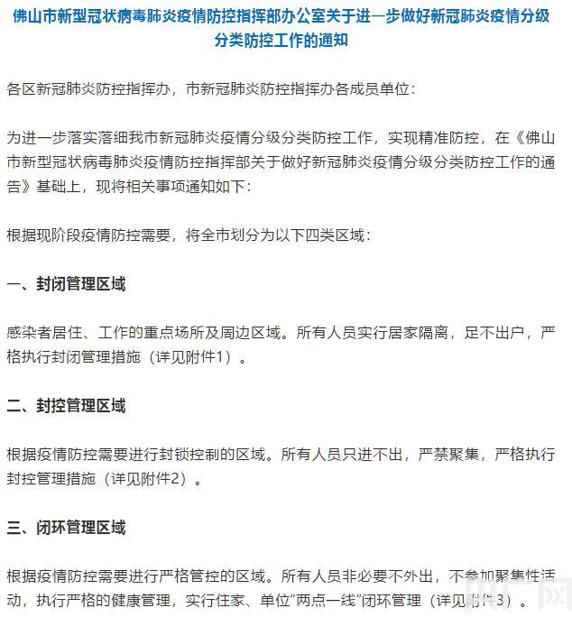 央廣網佛山6月6日消息(記者 夏燕)6月5日晚,佛山市新型冠狀病毒肺炎疫情防控指揮部辦公室發布通知,即日起實施分級分類防控,將全市劃分為封閉管理、封控管理、閉環管理及一般管理共四類區域。