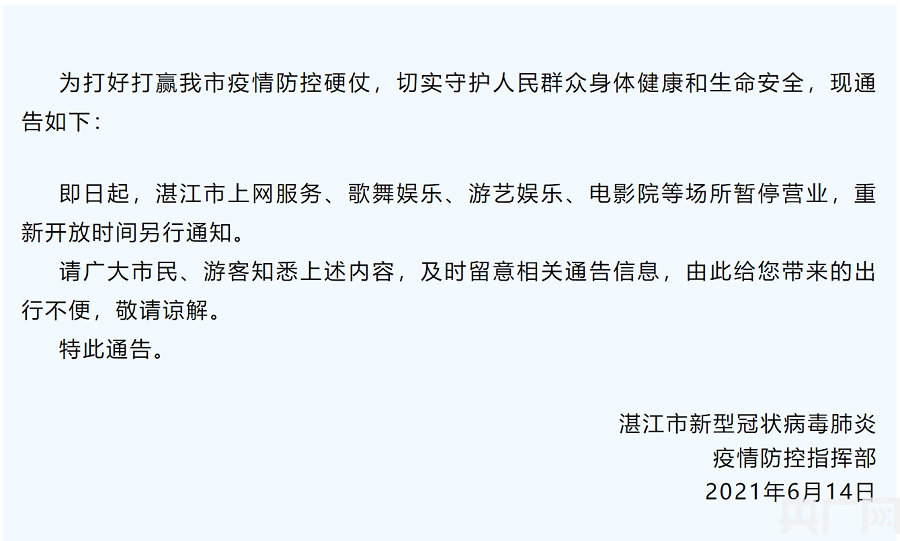 6月14日起,湛江市上網(wǎng)服務(wù)、歌舞娛樂、游藝娛樂、電影院等場(chǎng)所暫停營(yíng)業(yè),重新開放時(shí)間另行通知。