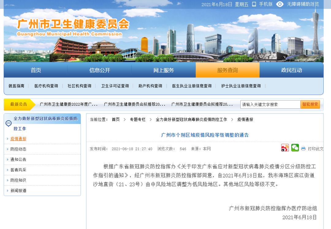 6月18日晚,廣州市衛健委網站發布關于廣州市個別區域疫情風險等級調整的通告,通告明確自2021年6月18日起,海珠區濱江街道沙地直街(21、23號)由中風險地區調整為低風險地區。其他地區風險等級不變。