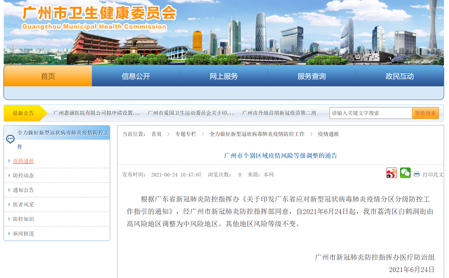 央廣網(wǎng)廣州6月24日消息(記者 張勝強)6月24日,記者從廣州市衛(wèi)生健康委員會官網(wǎng)獲悉,自2021年6月24日起,廣州荔灣區(qū)白鶴洞街由高風險地區(qū)調(diào)整為中風險地區(qū)。其他地區(qū)風險等級不變。