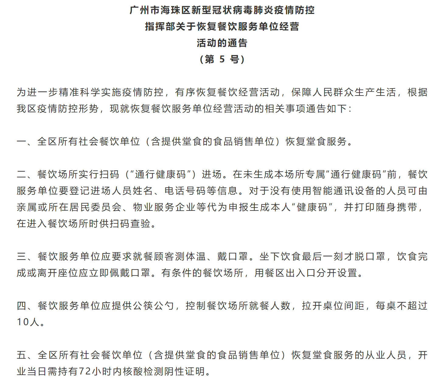 為進一步精準科學實施疫情防控,逐步恢復正常生產生活秩序,根據當前我區疫情防控形勢,現就逐步放寬餐飲服務單位經營活動的相關事項通告如下: