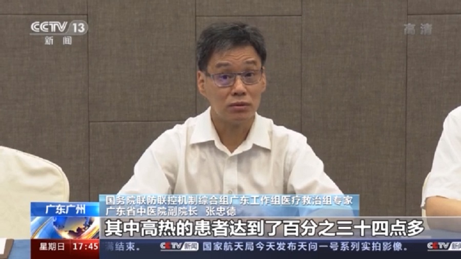 國務院聯(lián)防聯(lián)控機制綜合組廣東工作組醫(yī)療救治組專家、廣東省中醫(yī)院副院長 張忠德:本輪廣州疫情中高熱、發(fā)燒的病人特別多,我們統(tǒng)計了一下,166個病人之中,發(fā)熱的病人達到了百分之八十多,其中高熱的患者達到了百分之三十四點多,所以就對我們的治療帶來了挑戰(zhàn)。我們還發(fā)現(xiàn)患者從普通型向重癥轉變的時間很短,以前我們在其他地方看了可能是7天,可能9天,有些是第10天,這里有些第3、4、5天就轉變過去了,所以治療上就要求我們采取的措施要更果斷。