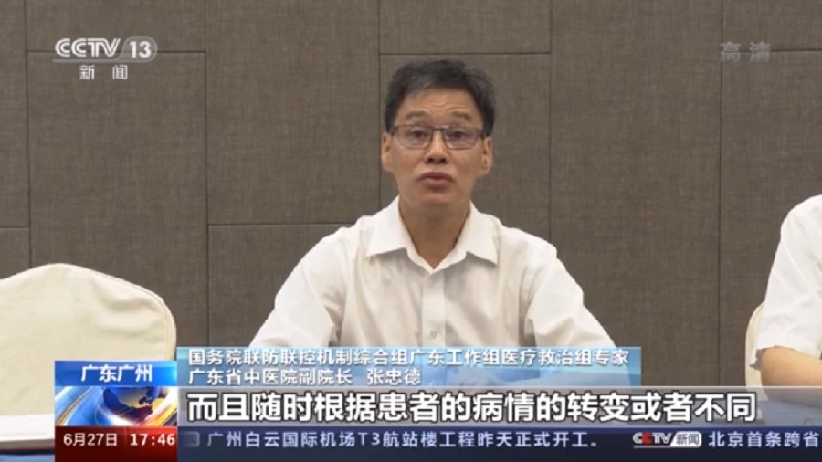 國務院聯(lián)防聯(lián)控機制綜合組廣東工作組醫(yī)療救治組專家、廣東省中醫(yī)院副院長 張忠德:在危重癥跟重癥患者中,我們始終堅持現(xiàn)代醫(yī)學的一些救治手段,呼吸機,ECMO,心電監(jiān)測,氣管鏡這些治療的同時,用中醫(yī)藥排毒,我們對每一個重病人跟危重病人都采用了一些中西醫(yī)協(xié)同治療方法,而且隨時根據患者的病情的轉變或者不同,隨時進行調整,才取得現(xiàn)在這樣階段性的重大成果。
