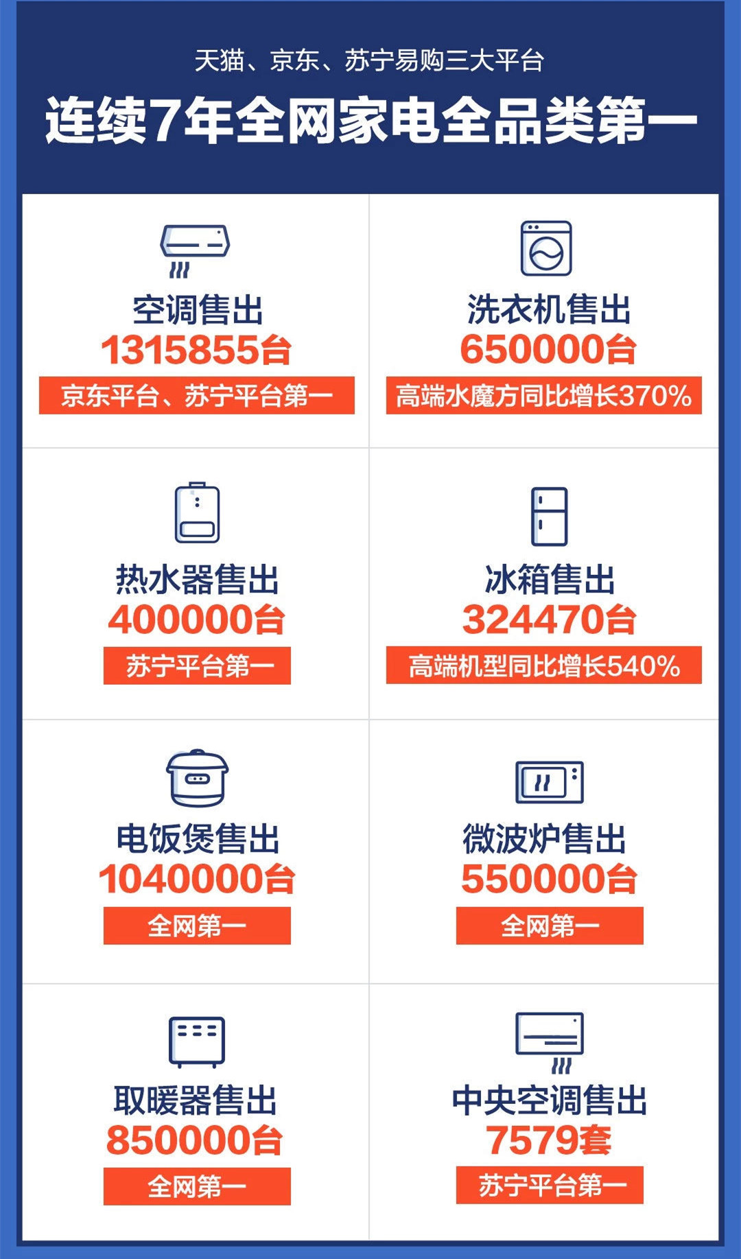 從細分品類看,單項“賽場”成績依舊亮眼:電飯煲、微波爐、取暖器三大品類均位居全網(wǎng)第一;熱水器和中央空調(diào)兩大品類均在蘇寧平臺銷售第一;空調(diào)銷售量達到131.58多萬臺,在京東平臺和蘇寧平臺上排名第一。