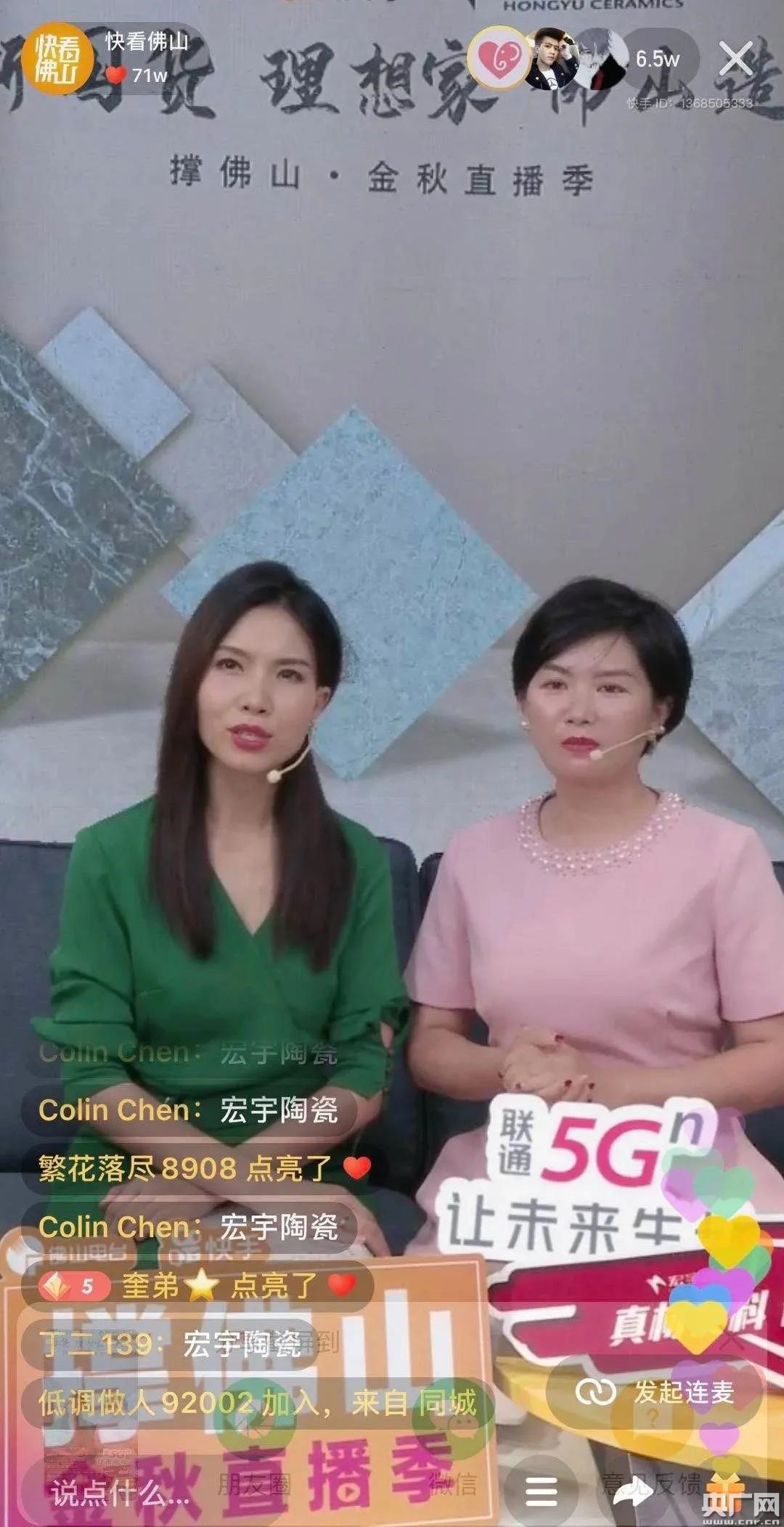 據(jù)了解,首批亮相5G直播室的有宏宇陶瓷、萬和電氣、聯(lián)邦家私、格蘭仕、東鵬陶瓷、佛山照明等品牌企業(yè)。其中,首場佛山企業(yè)—宏宇陶瓷專場,半小時(shí)點(diǎn)贊量超過100萬,最高實(shí)時(shí)在線人數(shù)近8萬。