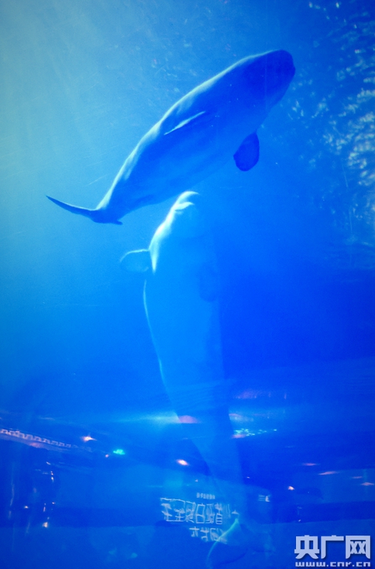 小白鯨“小五”與媽媽在玩耍。(央廣網發 主辦方供圖)