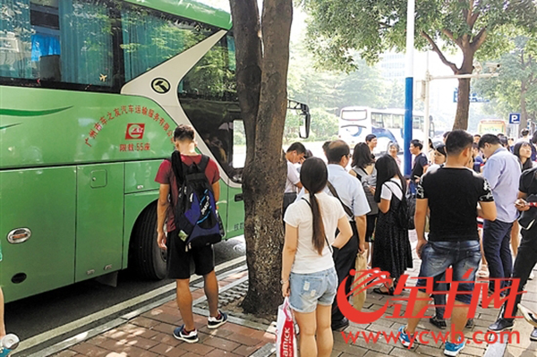 同樣的情景也在不遠處的珠江新城上演。同樣是8月20日下午6點,地鐵珠江新城站A2出口前,提著大包小包的人們站在逼仄的人行道上焦急地等待著。每隔幾分鐘就有一臺大巴車停靠在此,人群一陣騷動,不出兩分鐘,載上乘客的大巴就匆匆離去。