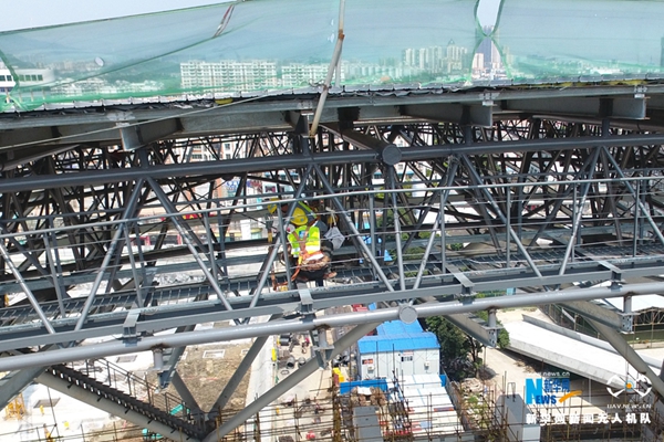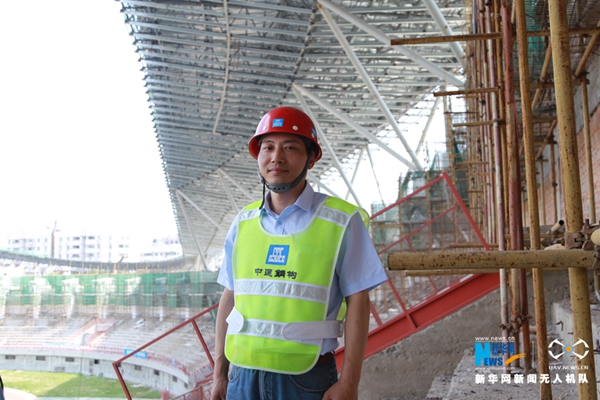烈日下,吊裝工人通過(guò)馬道登上體育場(chǎng)屋面開始施工。新華網(wǎng) 伍嘉煒攝