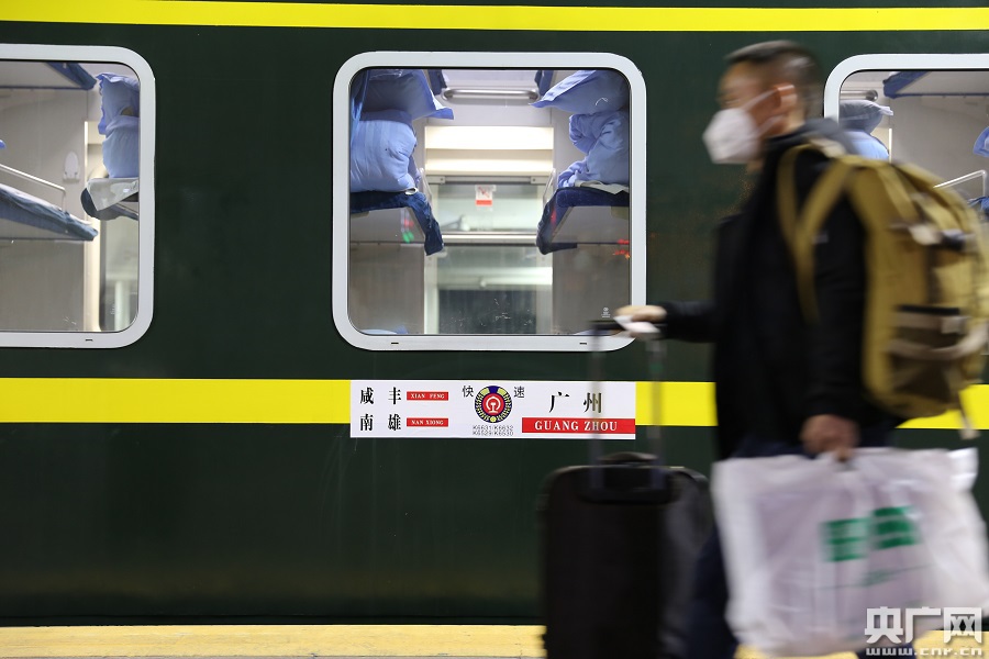 廣州站春運首趟臨客列車Z4190次(廣州—鄭州)于1日28日8點20分抵達鄭州站。(央廣網發 李文豪 攝)