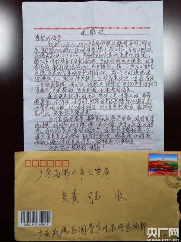 蒙乃政寄來的求助信。(央廣網發 佛山公安供圖)