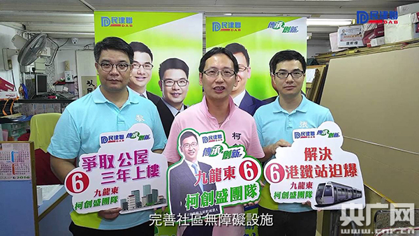柯:其實這個口號就能很好的表現(xiàn)出兩個狀況的。第一個就是反映出民建聯(lián)是一個能夠給年輕人多點嘗試參與政治機會的政黨。我們希望通過“有年輕,有干勁”這種想法,向議會注入新的動力。讓九東的市民知道年輕人是有能力,能夠擔(dān)當(dāng)起政治工作。第二句創(chuàng)新為九東,是因為九龍東面臨著很多老大難的問題,我們交通擁堵問題,長者人口多,貧窮問題嚴(yán)重,房屋問題備受關(guān)注。所以我們能夠希望通過新的思維,讓政府關(guān)注我們九龍東,所以就想到這個口號了。