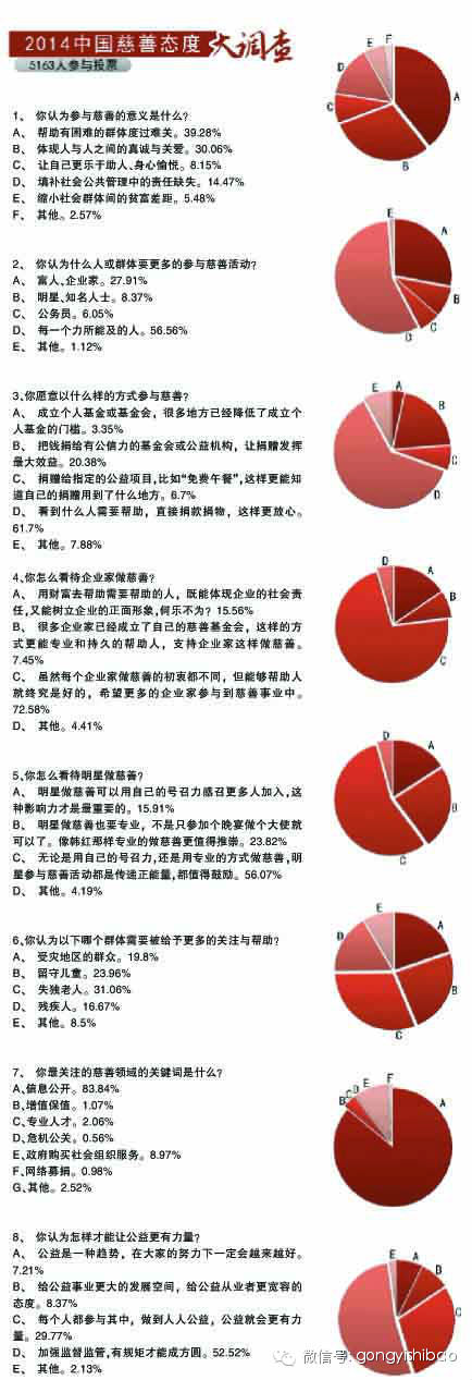 本次調查從4月15日18時至4月21日10時,共有5163位網(wǎng)友參與調查。從調查數(shù)據(jù)與網(wǎng)友留言中,我們能感受到公眾對公益慈善的關注日益強烈,人人公益的時代即將到來。