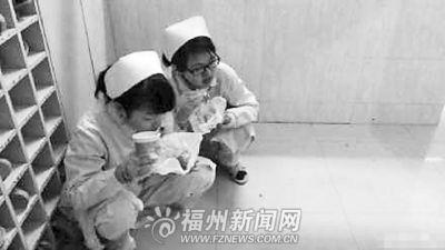 照片中,兩名年輕女護士正蹲在一個鞋柜旁,戴著一次性手套,埋頭吃快餐。該網友在微博上說,照片攝于福州一家醫院,這是這些護士的日常夜班狀態,如果遇上大規模的意外事故,她們可能連飯也吃不上。
