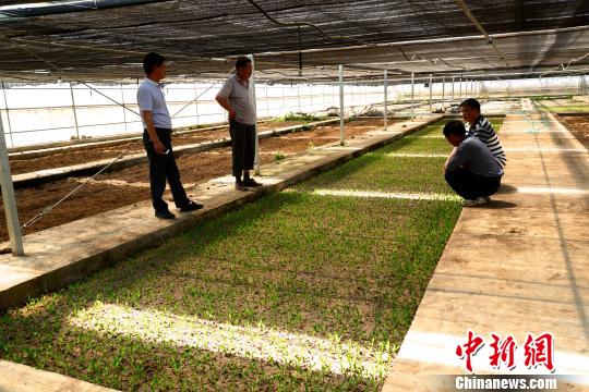 在育苗大棚內(nèi),技術(shù)人員對煙農(nóng)進(jìn)行育苗指導(dǎo)。 邢翀 攝