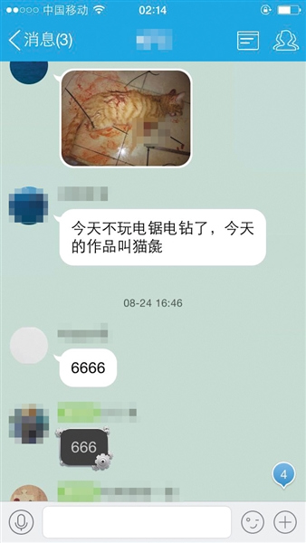 新京報(bào)記者獲得了多張虐貓群截圖,疑似當(dāng)事學(xué)生的QQ用戶在群里用照片直播的形式,將一只小黃貓鋸掉四肢,并砍下了腦袋,現(xiàn)場(chǎng)鮮血淋漓,并自稱“今天的作品叫做貓彘”。