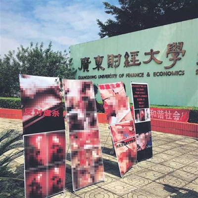 該事件昨日再起波瀾。昨日中午,有動(dòng)物保護(hù)志愿者持易拉寶、橫幅等材料前往廣東財(cái)經(jīng)大學(xué)三水校區(qū)門(mén)前進(jìn)行宣傳。據(jù)多位目擊者稱,校方安保人員與志愿者發(fā)生沖突。