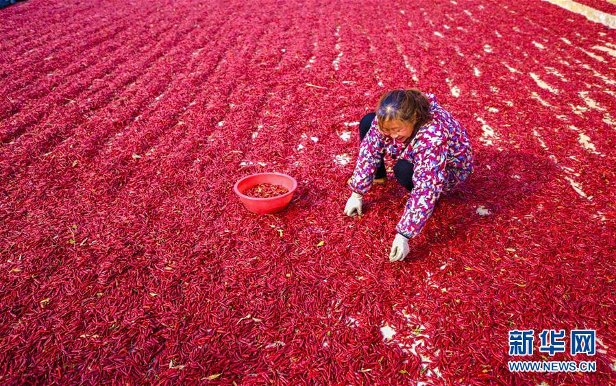 11月18日,在衡水市冀州區周村鎮辣椒加工交易基地,椒農在對摘好的辣椒進行二次篩選。