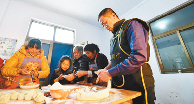 2018年,山西省聞喜縣張才嶺村的7戶貧困家庭搬遷到新村的“幸福小院”,組成“大家庭”。在全村脫貧后的第一個春節,第一書記牛方平(右一)和“幸福小院”的村民一起包餃子。