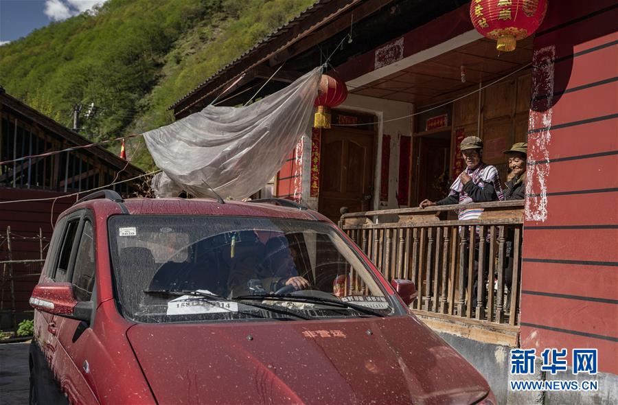 4月13日,云南省貢山縣獨龍江鄉獻九當村迪蘭村民小組村民李新榮(右二)看著兒子開車進院。