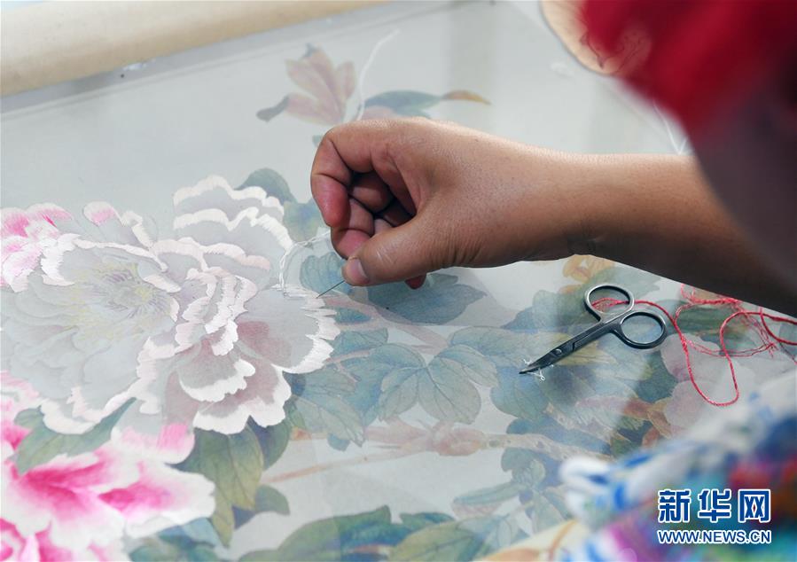 4月26日,王陸芬在位于白沙坡村的刺繡車間縫制繡品。
