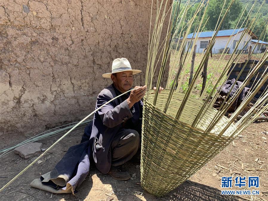 爾日書進在陽光下編制竹背簍(5月16日攝)。