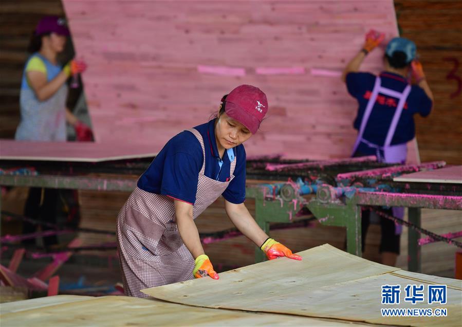 8月25日,在融水苗族自治縣粵桂扶貧協作產業園一家林木加工企業,工人在生產線上作業。這家林木加工企業共有300名工人,其中貧困戶有169人。
