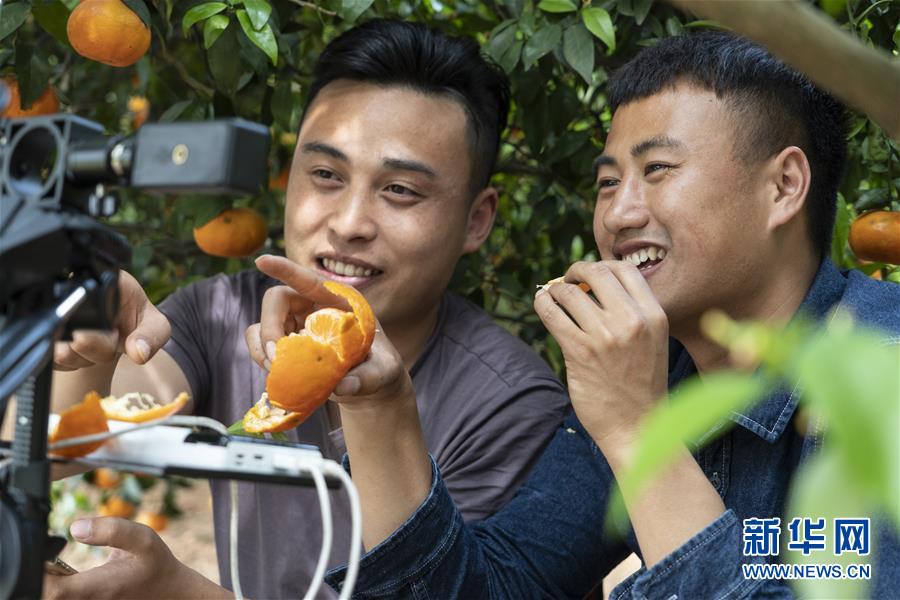 4月25日,肖欽仁(右)和朋友在成都金堂縣趙家鎮陽河街社區的一片果園做直播。 新華社記者 李夢馨 攝