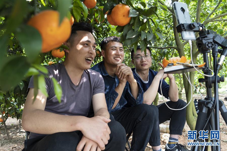 4月25日,肖欽仁(中)和朋友在成都金堂縣趙家鎮陽河街社區的一片果園做直播。 新華社記者 李夢馨 攝
