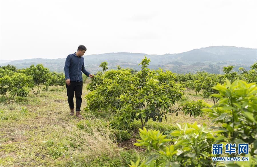 4月25日,肖欽仁走過成都金堂縣趙家鎮陽河街社區的一片果園。 新華社記者 李夢馨 攝