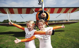 她們是來自英國的表姐妹羅絲·鮑威爾和弗拉姆·布魯爾。兩人被安全裝置固定在祖父的古董雙翼飛機(jī)上,以每小時(shí)160公里的速度飛過格洛斯特郡上空。