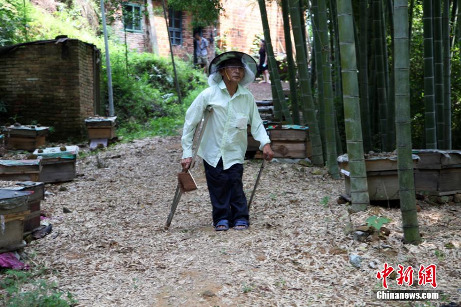 8月6日,湖南省資興市興寧鎮朝光村何家組村民樊細萬正忙著取蜂蜜。64歲的樊細萬因小兒麻痹癥落下二級殘疾,行動極為不便。他卻身殘志堅,不等不靠,10多歲就拄著雙拐,利用東江湖畔良好的生態環境與豐富的山林資源,孤身一人來到深山養蜂,終身與蜂為伴,一干就是50年。目前,樊細萬共養了70多箱蜂,年產土蜂蜜600多斤。 靠雙拐行走。朱孝榮 攝