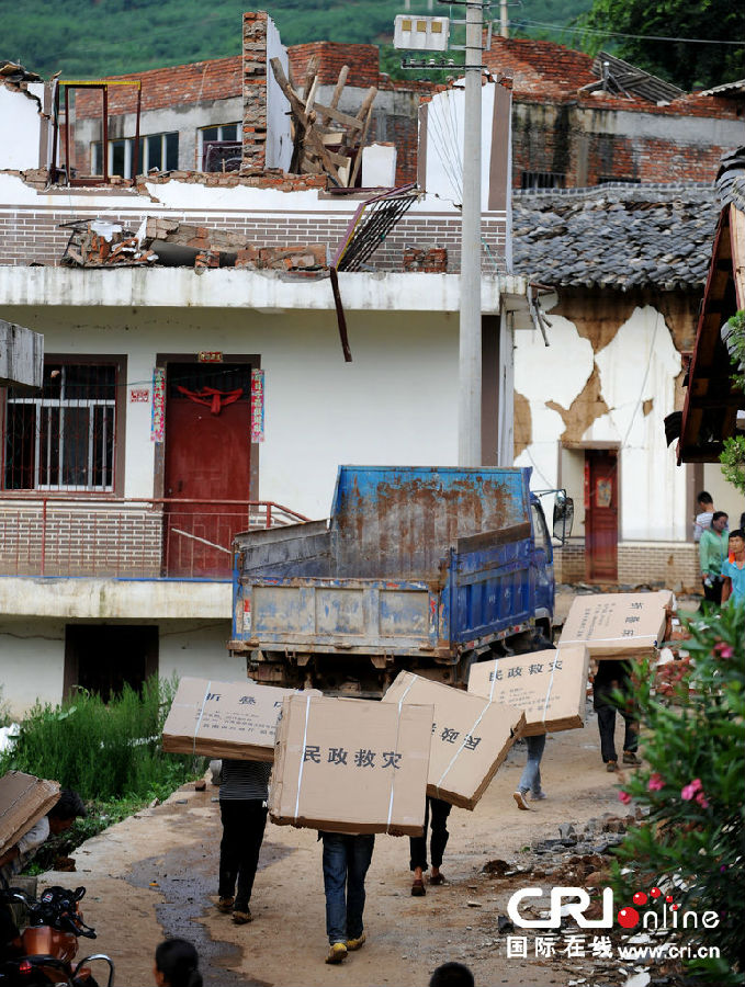 2014年8月4日,云南省魯甸縣,震中龍頭山鎮村民領取救援物資。圖片來源:攝記/CFP