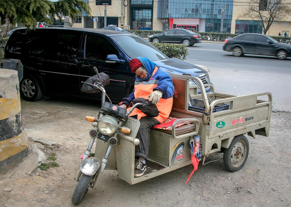 2016年2月21日,江蘇省徐州市,一位年邁的環(huán)衛(wèi)工老奶奶把大街上的紙屑和垃圾打掃的干干凈凈,清理完畢后,疲勞地坐睡在路旁的電動(dòng)三輪車座位上。