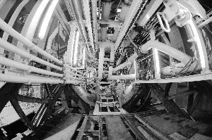 在盾構機頭部,也就是盾構主機的后方,四五名技術人員正在拼裝隧道管片,這些重達3.2噸的圓弧形混凝土被龍門吊吊至盾構機后部的小車廂內,一節節車廂再沿著盾構機上窄窄的軌道送至主機附近,掛在連接橋上的大鉤子接著將管片吊起,滑至主機后方后放置到可以旋轉的機器上。技術人員將管片用巨大的螺帽固定,機器向上旋轉,再固定下一塊管片,大小不一的6塊管片全部固定后,形成一個閉合的圓環。