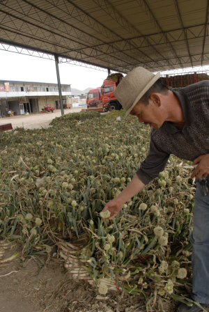 洋蔥的價(jià)格從兩周前的每斤0.60元一下子跌到每斤0.15元,這讓批發(fā)商韓先生始料未及。