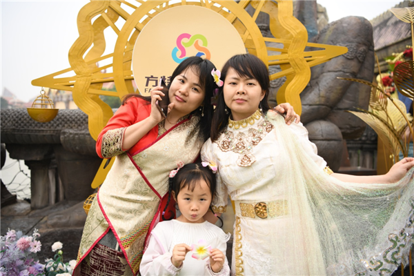 游客身穿特色服飾合影(央廣網發 南寧方特東盟神畫主題樂園供圖)
