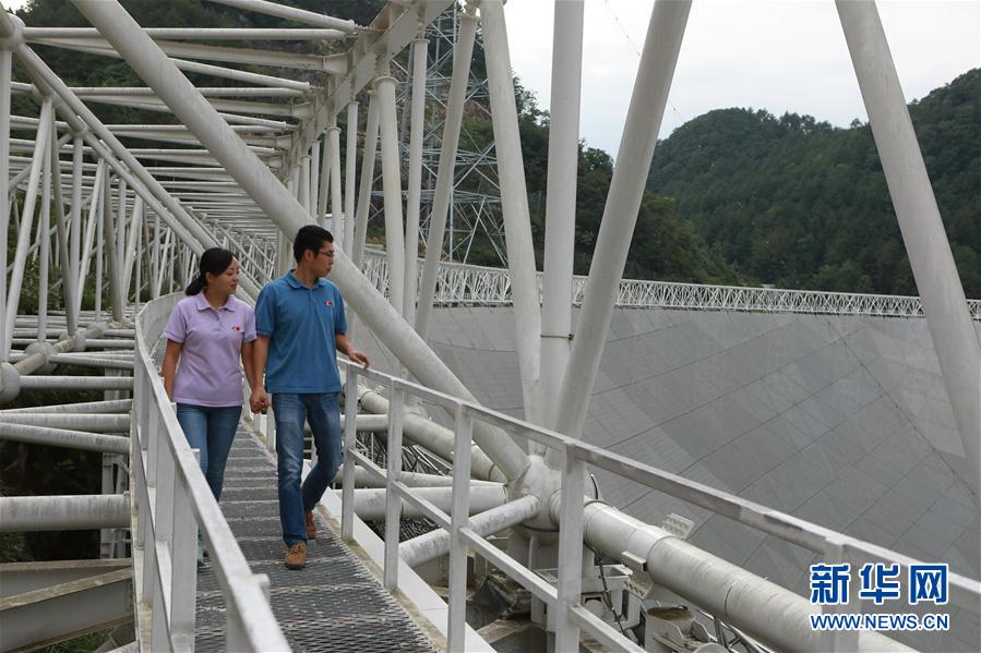 孫純(左)與石向瑋在FAST總控室內(nèi)觀看FAST全景圖(8月9日攝) 新華社記者張傳奇 攝 在世界最大單口徑射電望遠(yuǎn)鏡——500米口徑球面射電望遠(yuǎn)鏡(FAST)項(xiàng)目組,光信息科學(xué)專業(yè)畢業(yè)的孫純和熱能與動力工程專業(yè)畢業(yè)的石向瑋因FAST結(jié)緣,在今年7月完婚。他們的結(jié)合,被同事們戲稱為“光”與“熱”的結(jié)合。 -