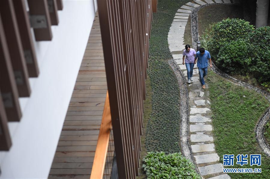 孫純(左)與石向瑋在公寓內(nèi)綠化帶上散步(8月9日攝)。新華社記者歐東衢 攝 -