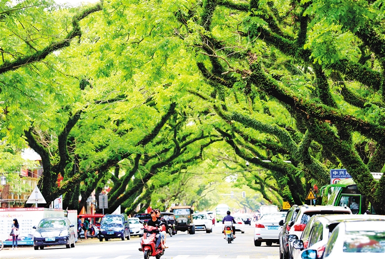 瓊海中原鎮藤蘿雨樹相映,成夏日的一道風景。海南日報記者 陳元才 攝
